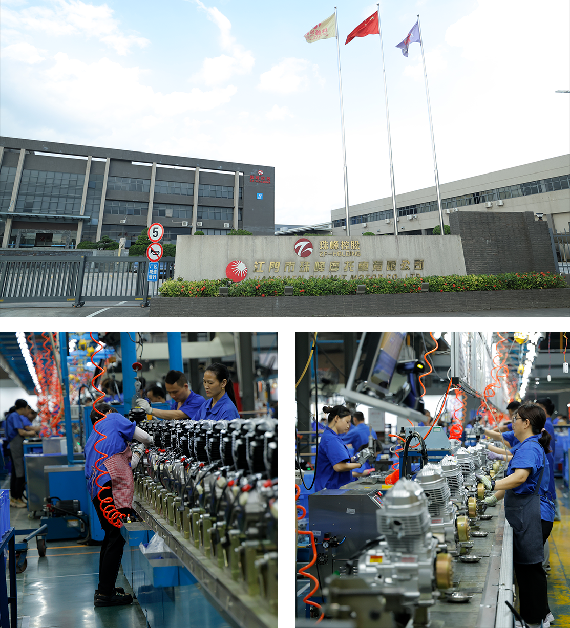 公司座落于江门市杜阮南路7号珠峰工业区内,总投资4亿元人民币,占地面积高达200亩,运用了现代科学的理念,创造先进的工厂布局,厂内建有整车生产车间、发动机生产车间、CKD生产车间,拥有先进的摩托车整车总装流水线、车架部装线、发动机装配流水线、包装生产线等,年产摩托车可达80万台,发动机100万台,工厂不但环境优美,而且各类福利设施(如饭堂、宿舍、娱乐设备)配备齐全,给员工一个良好的工作、生活环境。